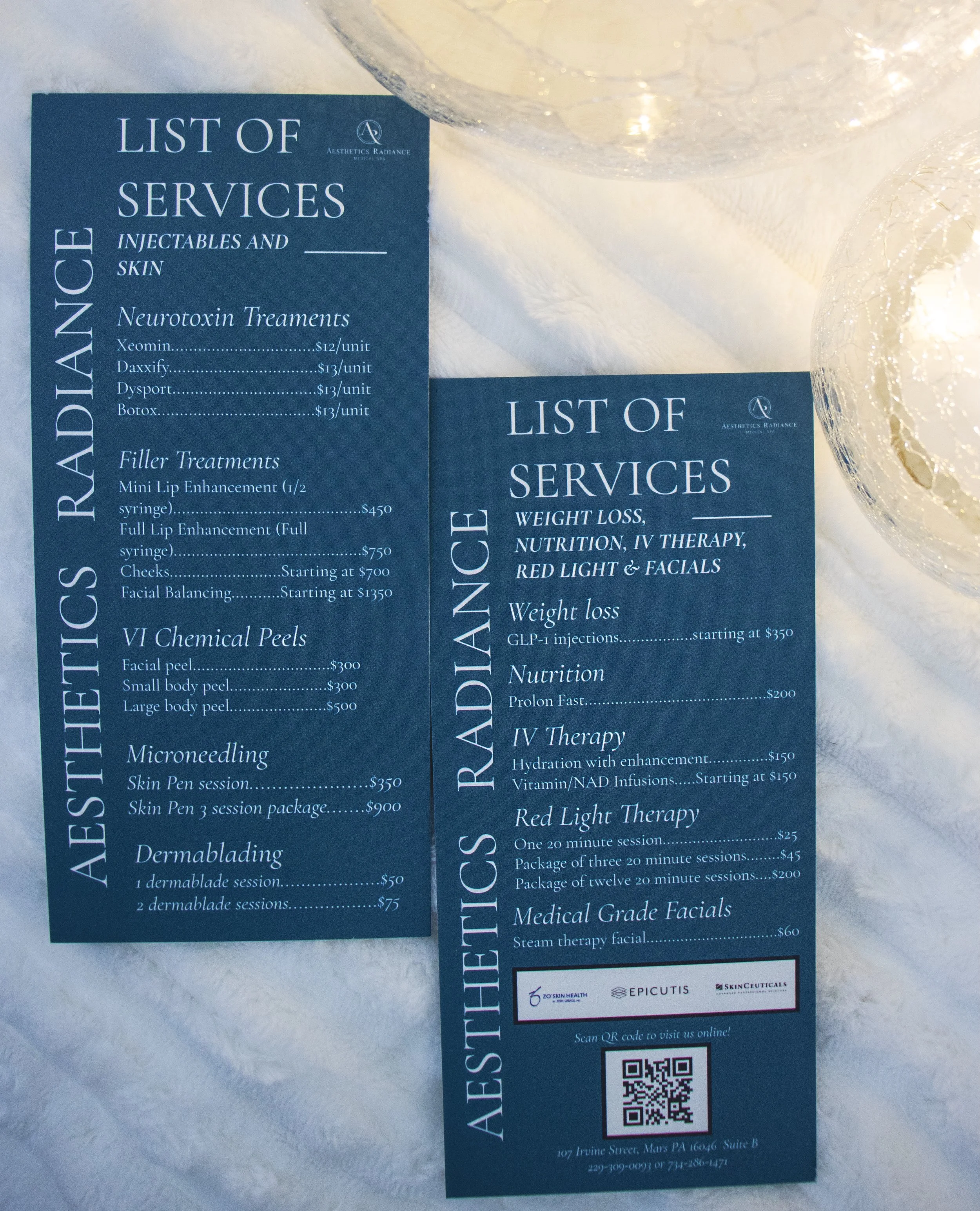 Phone: 724-504-1381 (Call or Text)email: aestheticsradiancemedicalspa@gmail.com Contact Us We look forward to helping you look and feel your best. Please do not hesitate to reach out to us with any questions or for additional information.